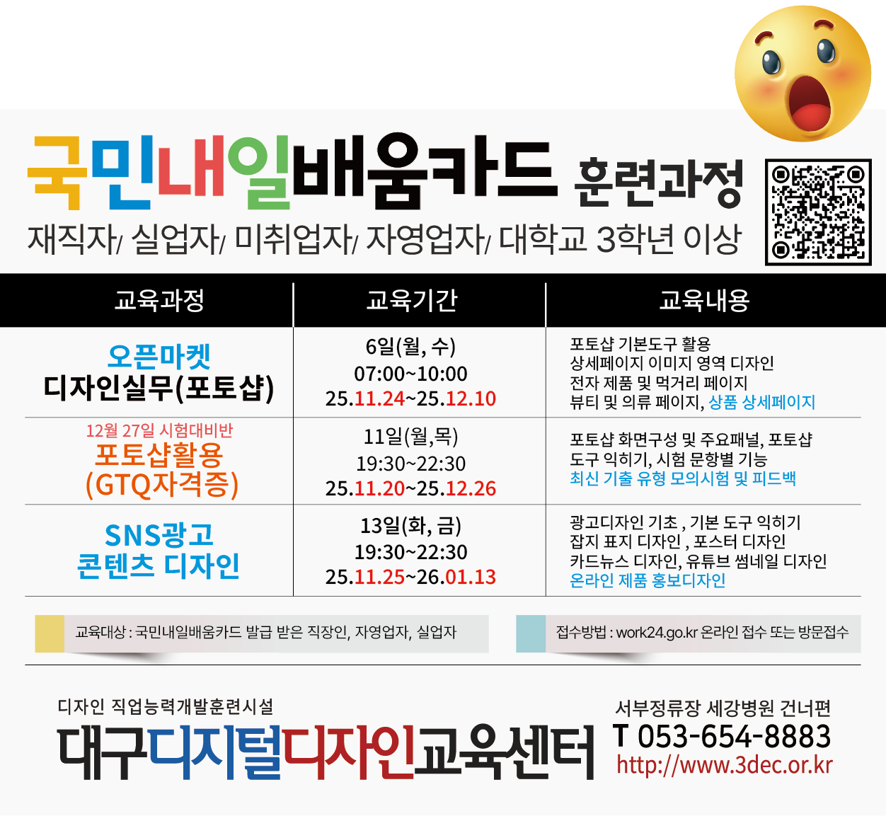 12월 8일 오픈마켓디자인실무(포토샵) 모집중 “아침 7시, 도시가 움직이기 시작하는 순간.스타벅스와 파리바게뜨가 문을 열 듯여러분의 실무 감각도 함께 켜질 시간입니다.오픈마켓 디자인 실무, 지금 배우세요.” 온라인 수강신청 25년 남은 GTQ도전기회 25 program Intensive Course History of 3dec 2025 교육프로그램 1. 포토샵CC활용기초(국민내일배움카드)2. 포토샵활용(GTQ자격증)3. 오픈마켓디자인실무(포토샵)4. SNS광고콘텐츠디자인 5. 카페24 쇼핑몰디자인6. 워드프레스 홈페이지제작7. Chat GPT 기반 광고디자인8. 미리캔버스, 캔바디자인 국민내일배움카드 지원 훈련과정 11월 과정안내 오전시간 훈련과정을 찾고 계신가요? 국민내일배움카드 지원 훈련과정 "오픈마켓디자인실무(포토샵)" 과정 모집중 교육기간: 2025.10.24~12.10 교육시간: 월,수(079:00~10:00) 문의: 053-654-8883 온라인 수강신청 1:1 상담 내일배움카드/온라인수강신청 컴퓨터그래픽기능사 포토샵,일러스트,인디자인자격증 대구지역 취업정보 디자인스킬 과제물피드백 지금 필요한 디자인, 지금 배우자 배우면, 바로 써먹는 디자인 실무포토샵 · 오픈마켓 · SNS 콘텐츠디지털 디자인은 여기서 끝내자.2025년 마지막 1회 남은 “포토샵GTQ 자격증” 과정 11월 20일 개강 1:1 오픈채팅 2025, 대구디지털디자인교육센터. All rights reserved. Facebook-f Instagram Youtube
